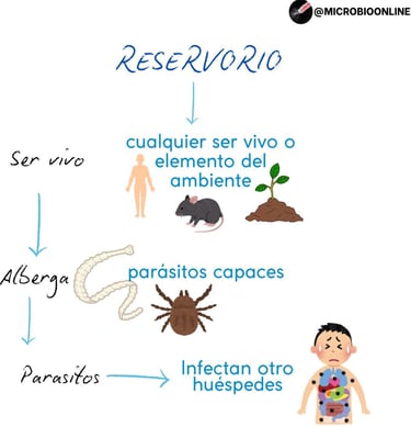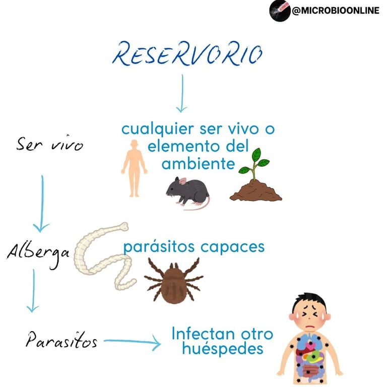 Un reservorio es cualquier ser vivo o elemento del ambiente (humano, animal, planta, objeto) que alberga parásitos capaces de infectar a otros huéspedes.