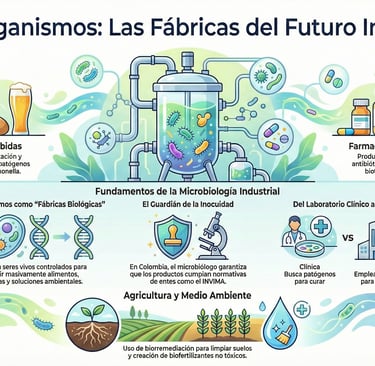 A diferencia del laboratorio clínico, donde buscamos identificar patógenos para curar pacientes, en la industria utilizamos los microorganismos (bacterias, levaduras, mohos) como pequeñas "fábricas biológicas" para producir bienes que usamos todos los días.